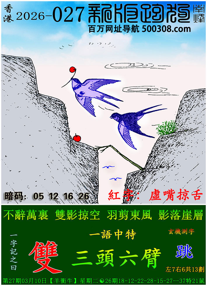 027期跑狗一字記之曰:【雙】不辭萬裏,雙影掠空。羽剪東風,影落崖層。玄機測字:《跳》一語中特:三頭六臂...