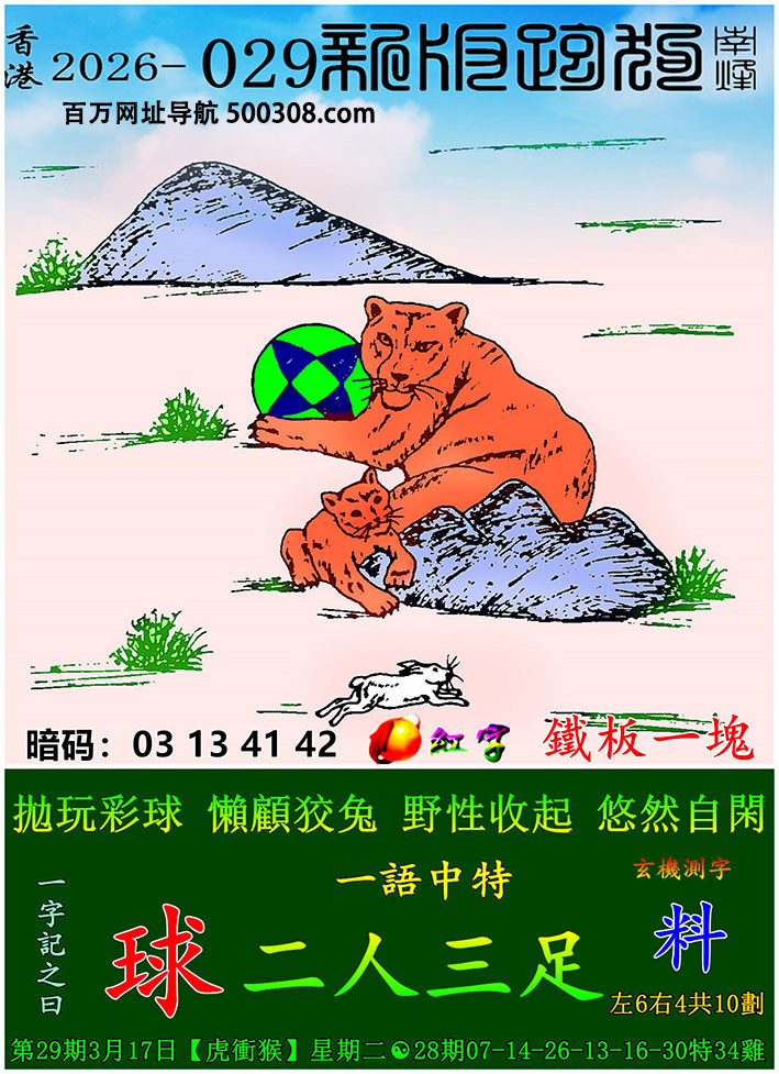 029期跑狗一字記之曰:【球】拋玩彩球,懶顧狡兔。野性收起,悠然自閑。玄機測字:《料》一語中特:二人三足...