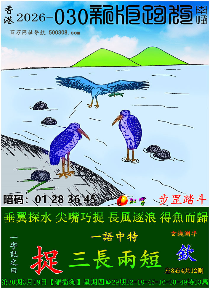 030期跑狗一字記之曰:【捉】垂翼探水,尖嘴巧捉。長風逐浪,得魚而歸。玄機測字:《欽》一語中特:三長兩短...