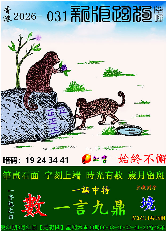 031期跑狗一字記之曰:【數】筆畫石面,字刻上端。時光有數,歲月留斑。玄機測字:《境》一語中特:一言九鼎...