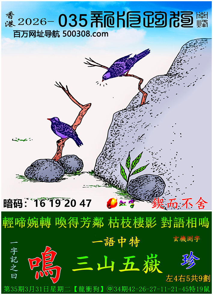 035期跑狗一字記之曰:【鳴】玄機測字:《珍》輕啼婉轉,唤得芳鄰。枯枝栖影,對語相鳴。一語中特:三山五嶽...