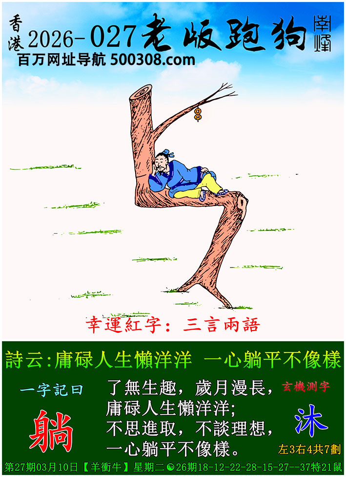 027期老版跑狗一字記之曰:【躺】 詩雲:庸碌人生懶洋洋,一心躺平不像樣。