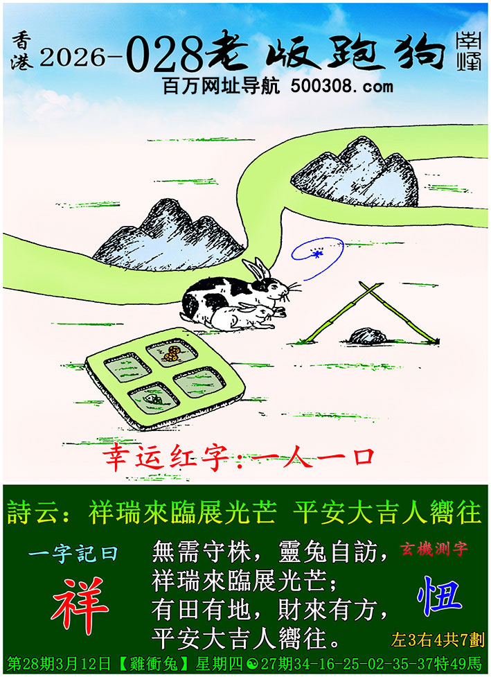 028期老版跑狗一字記之曰:【祥】詩雲:祥瑞來臨展光芒,平安大吉人嚮往。無需守株,靈兔自訪,祥瑞來臨展光芒;有田有地,財來有方,平安大吉人嚮往。玄機測字:《忸》...