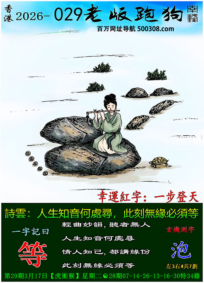 029期老版跑狗一字記之曰:【等】詩雲:人生知音何處尋 此刻無緣必須等。