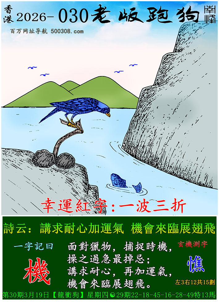 030期老版跑狗一字記之曰:【機】 詩雲:講求耐心加運氣,機會來臨展翅飛。