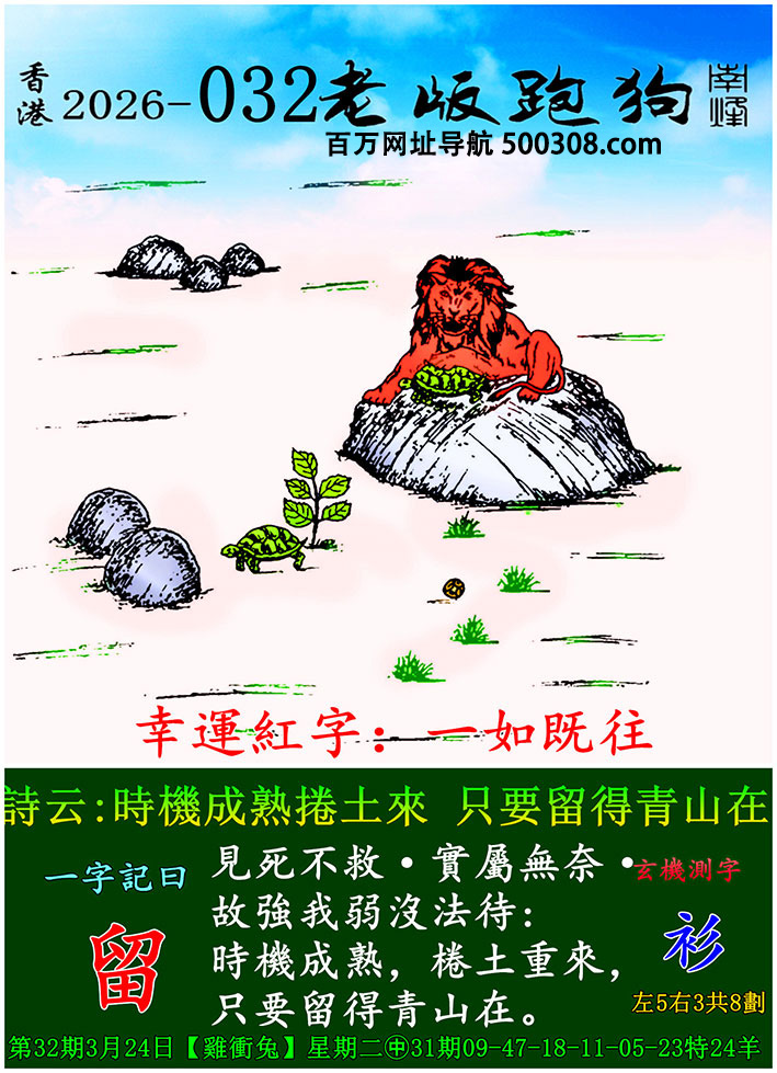 032期老版跑狗一字記之曰:【留】 詩雲:时機成熟捲土来 只要留得青山在
