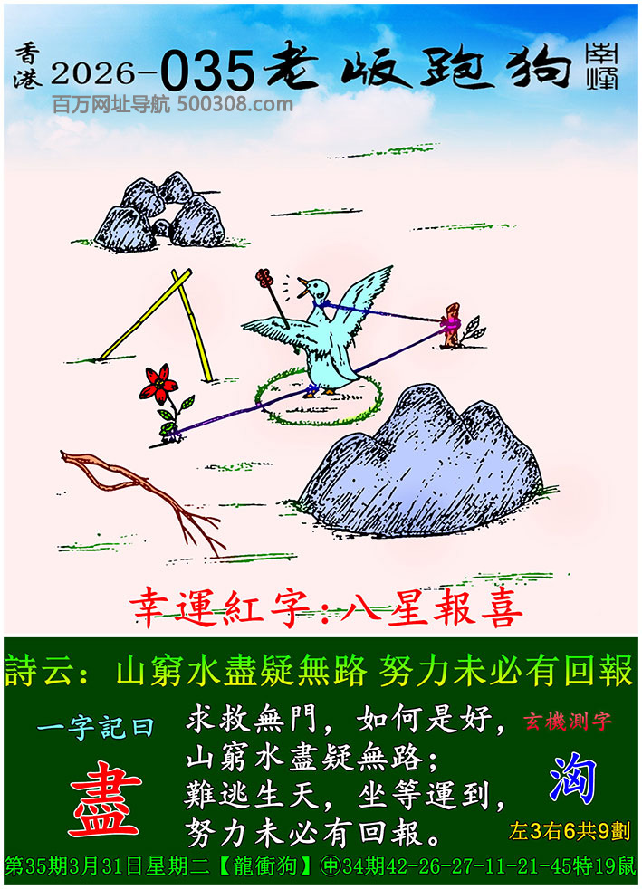 035期老版跑狗一字記之曰:【盡】 詩雲:山窮水盡疑無路,努力未必有回報。